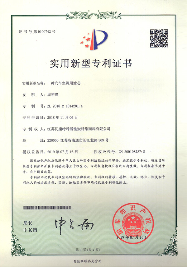 專利證書一種汽車空調用濾芯