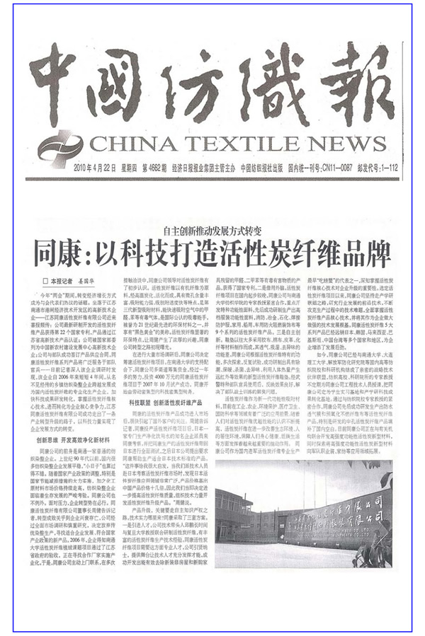 中國(guó)紡織報(bào)——同康:以科技打造活性碳纖維品牌